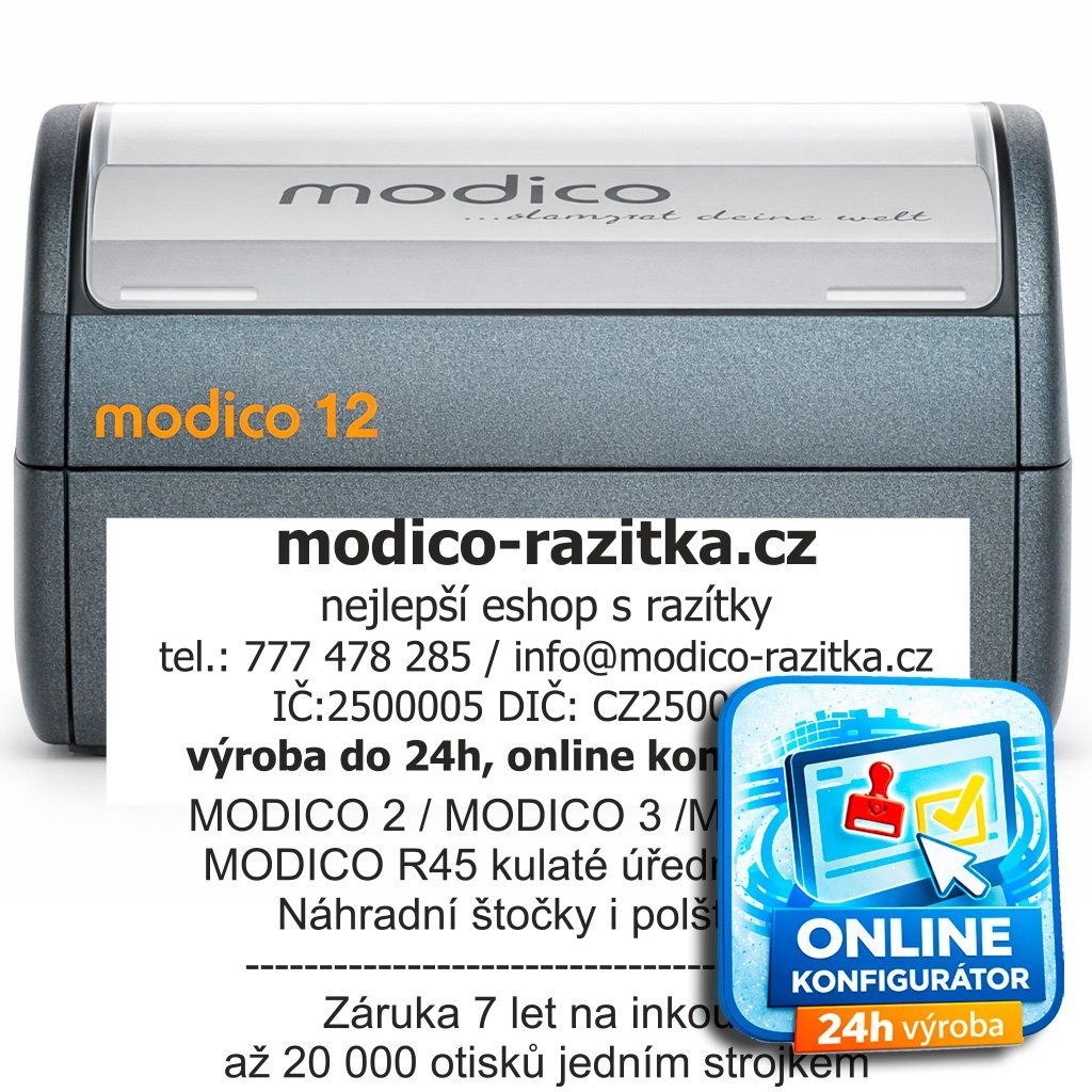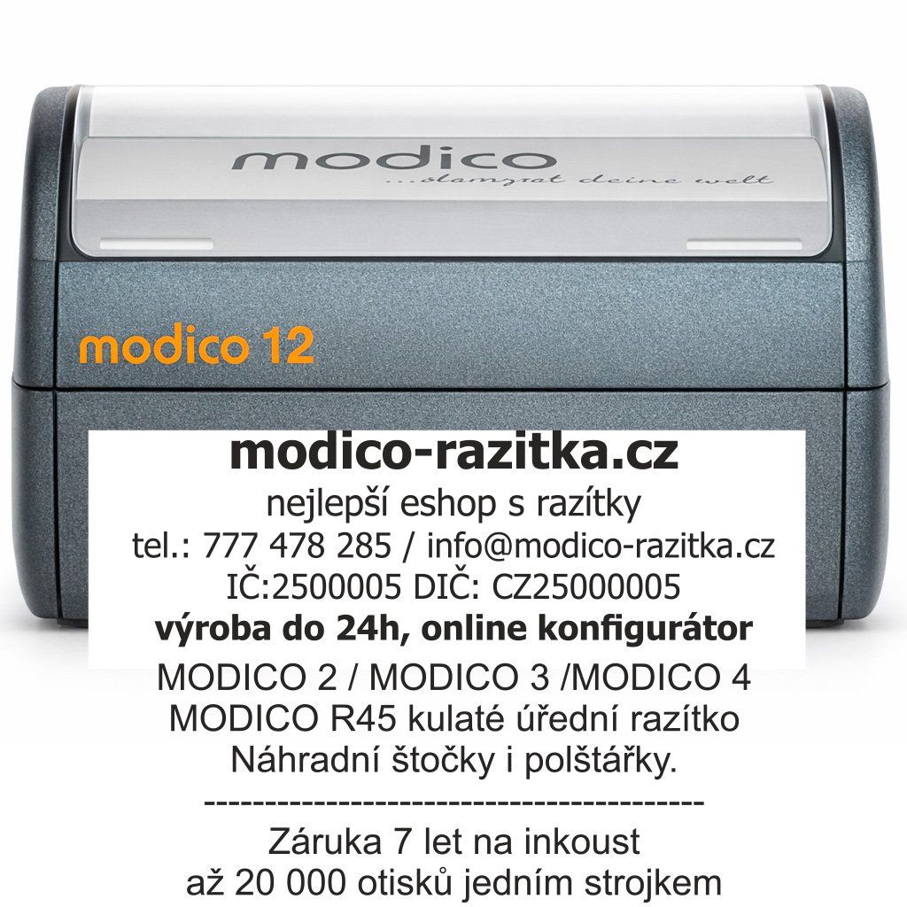 Profesionální razítko s vynikající a dlouhotrvající kvalitou otisku Modico M12. Tisková plocha 80 mm x 62 mm. Hlavní předností razítek modico je schopnost tisknout velmi tenkou linku a drobné písmo (např. podpis). Revoluční design: ergonomický design se soft feel povrchem. Barva těla: černá, červená, modrá, zelená, tmavo modrá.